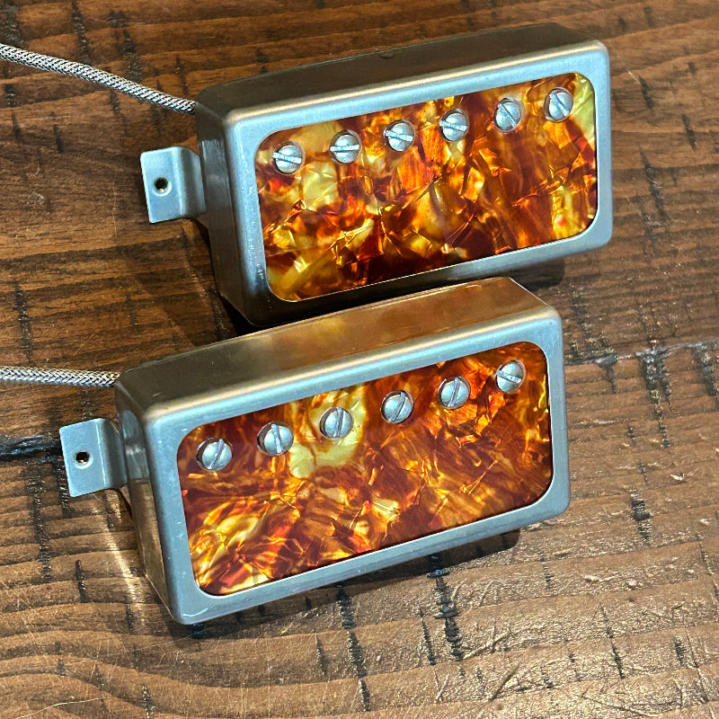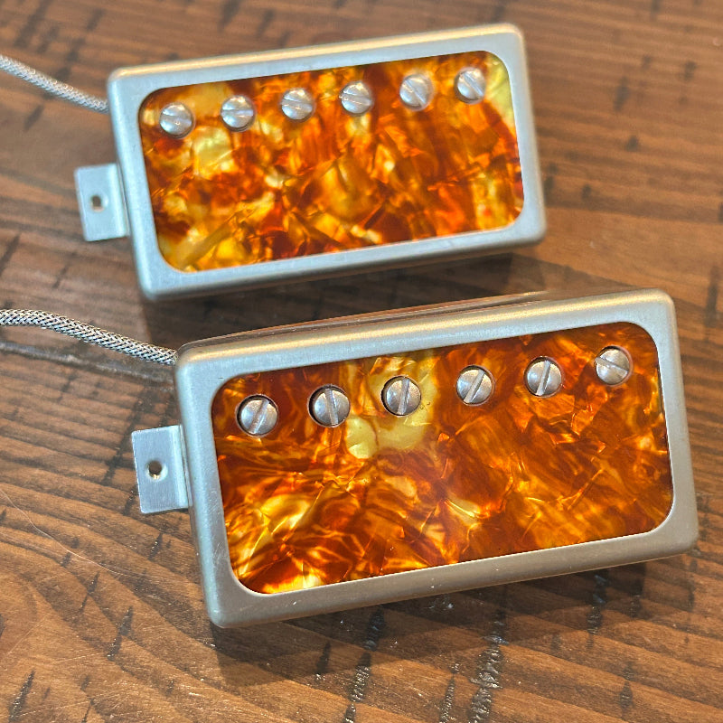 Our 1960 PAF set with Custom Fire Top Celluloid fabricated in house with raw open face cover and brushed nickel polepieces. This set won't last long!