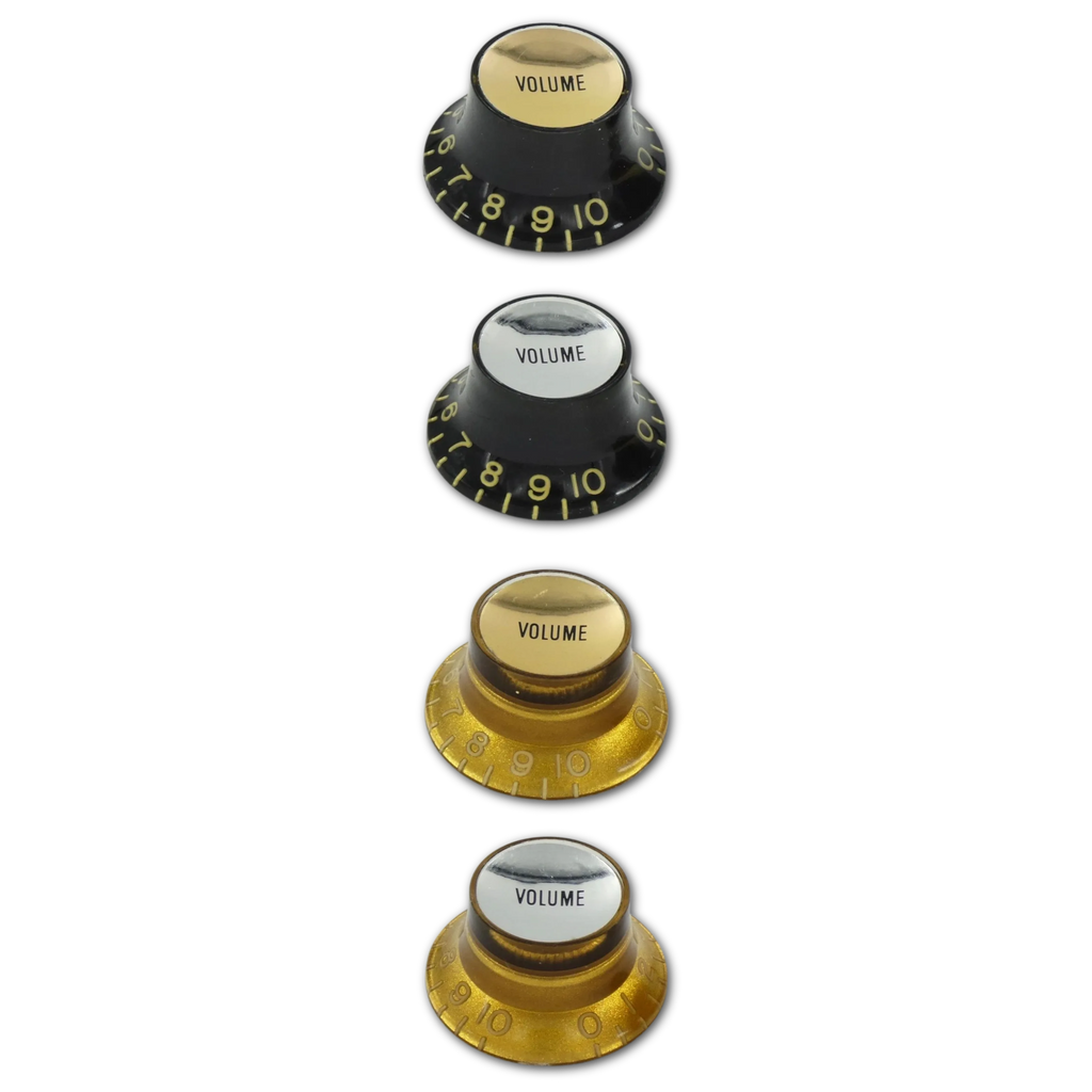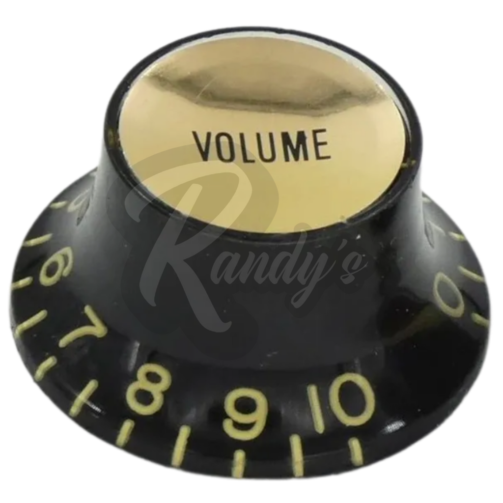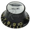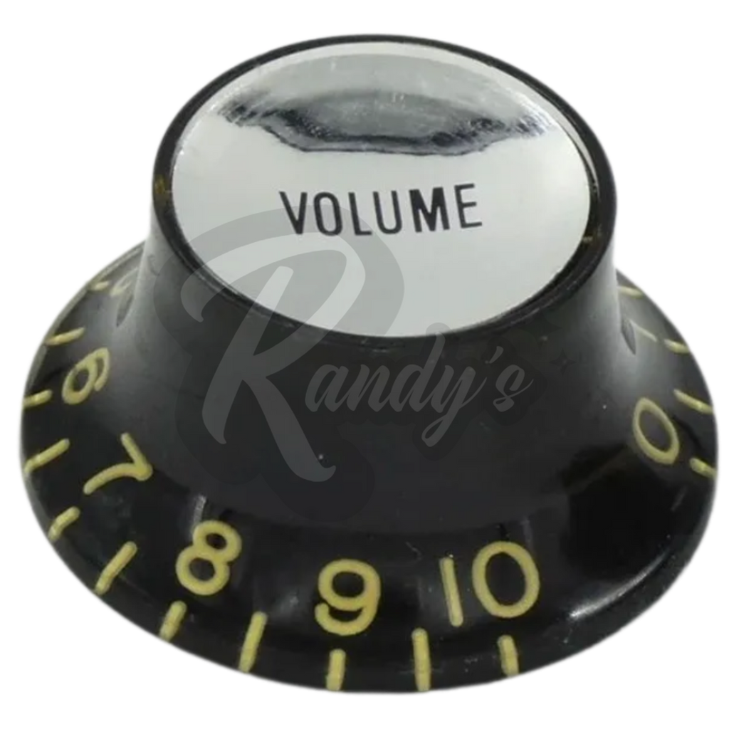 Individual historic "VOLUME" knob for electric guitar. To be used with fine knurled splined shaft pots. Embossed. CAB plastic. Fits Gibson®. Available in:
